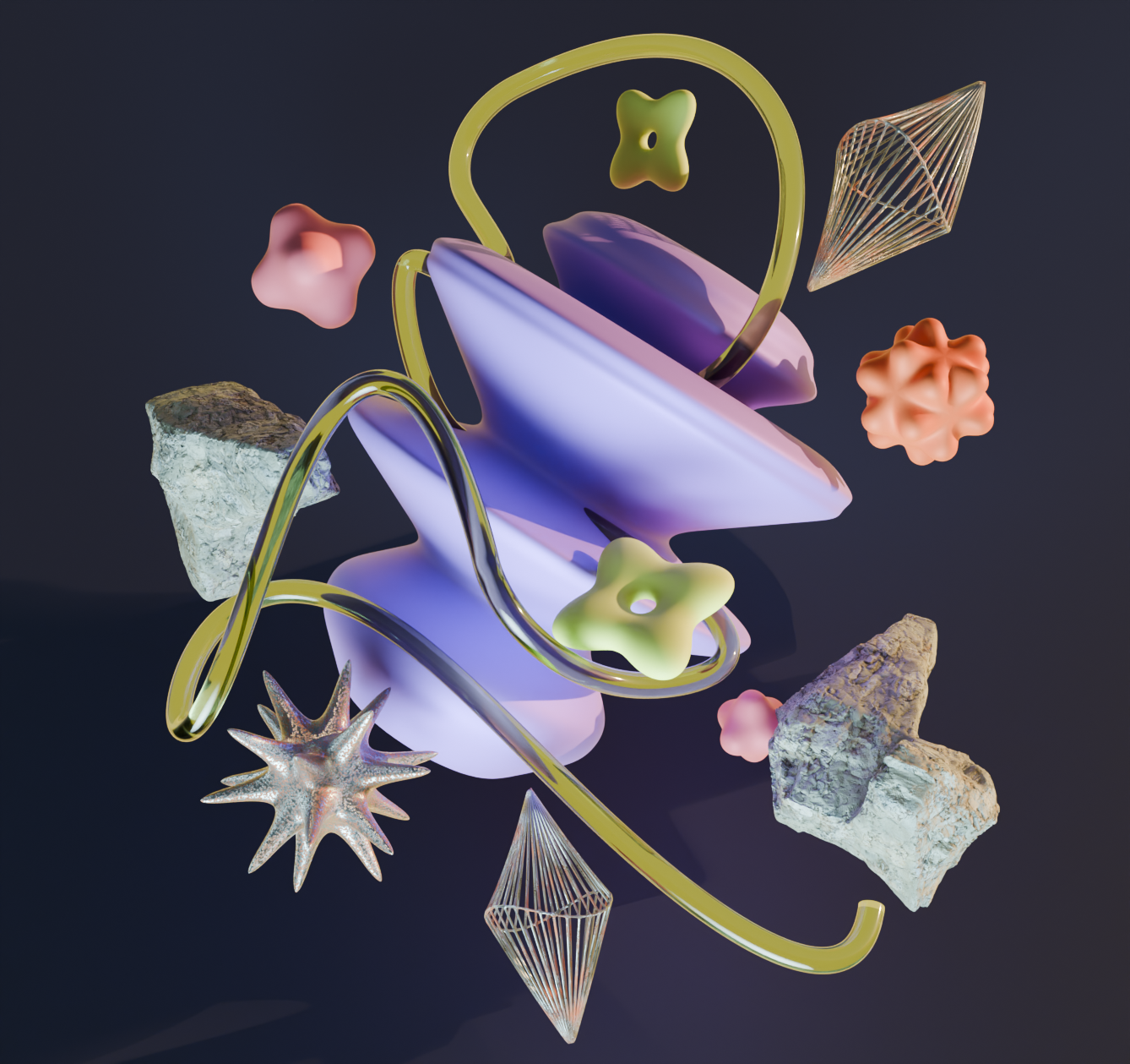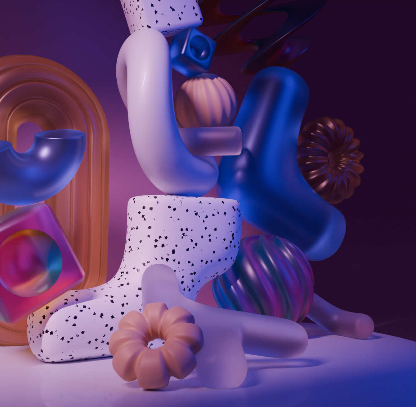 Using Blender, create spatial geometric-style compositions. The scenes must include only self-created objects.