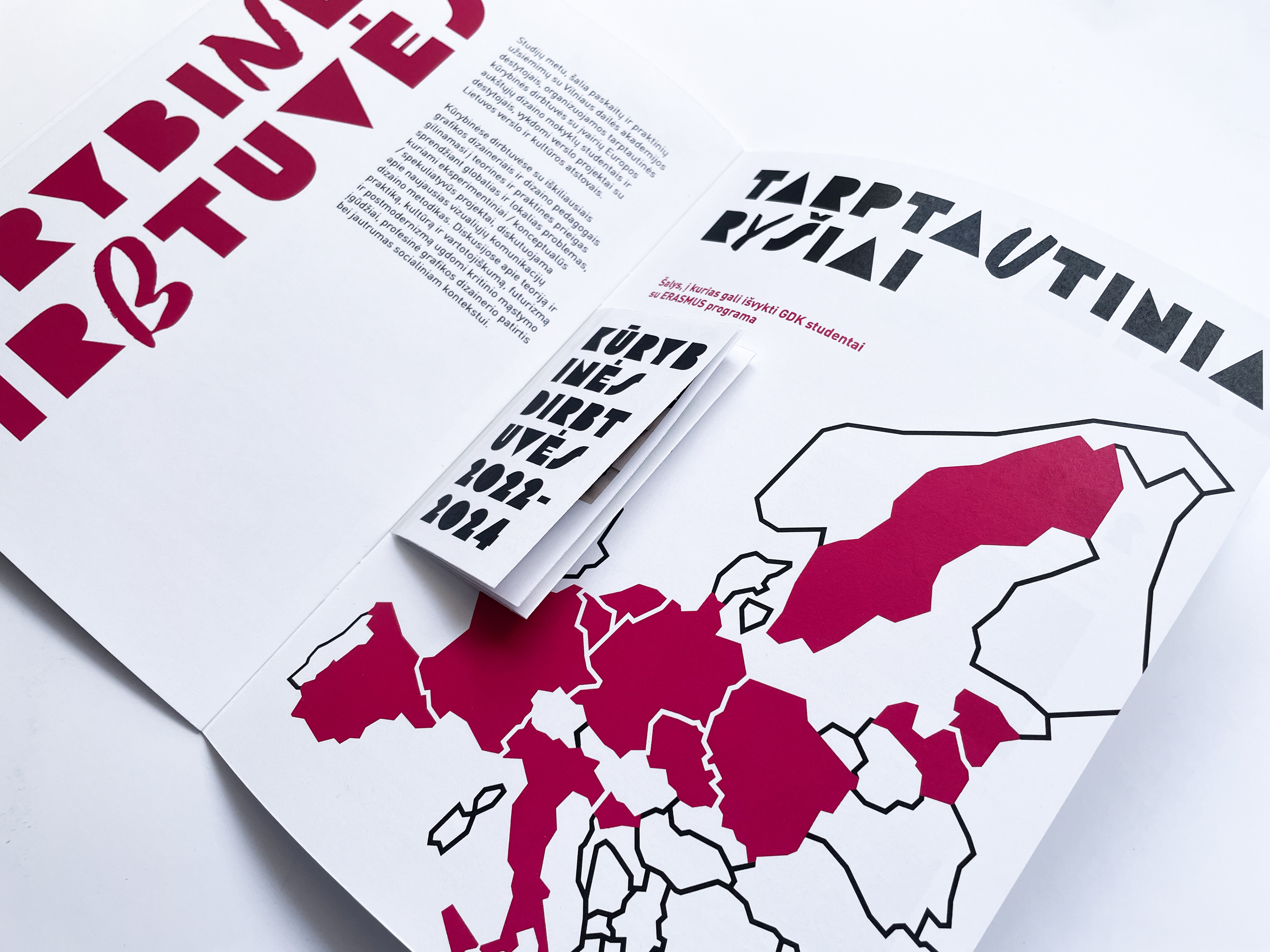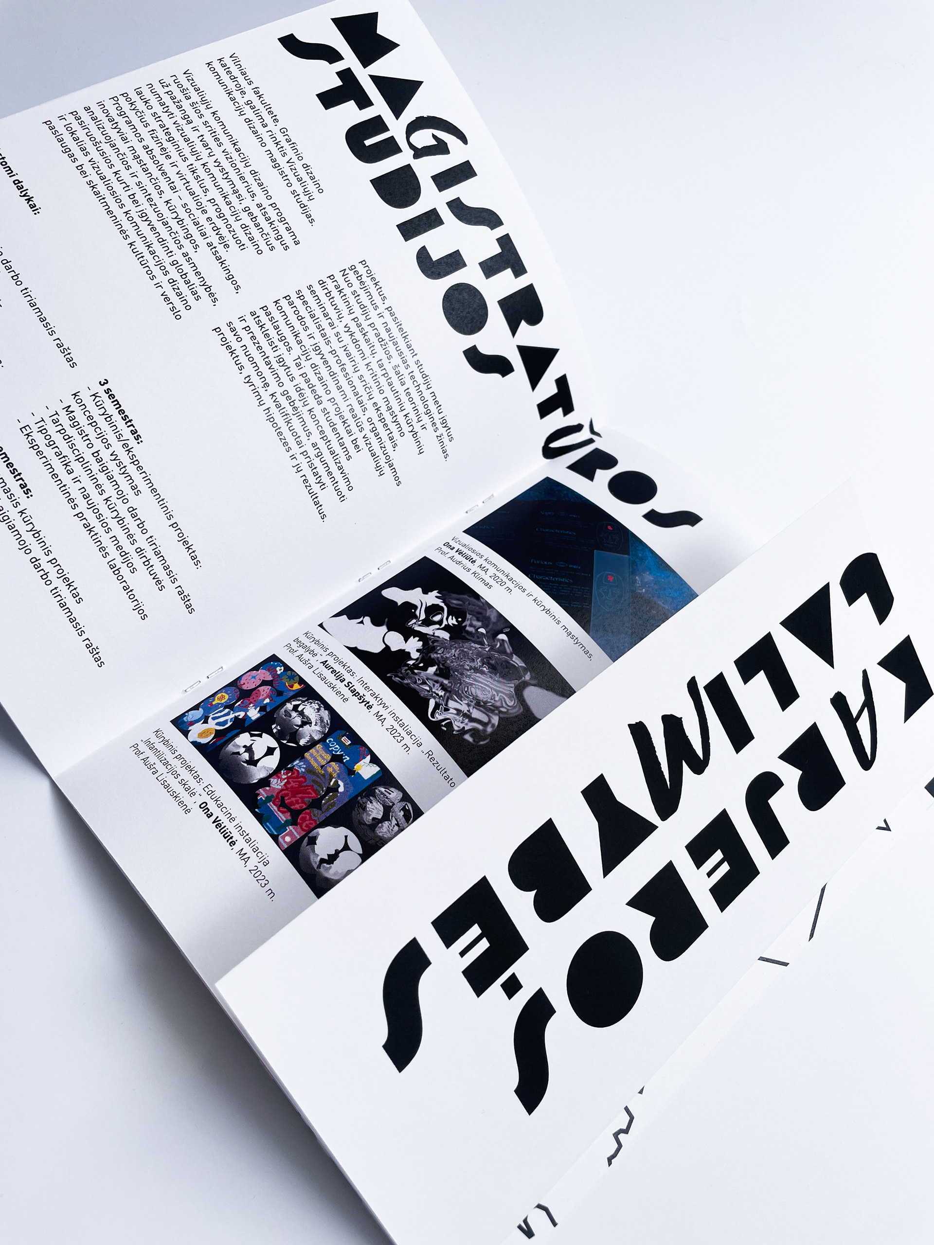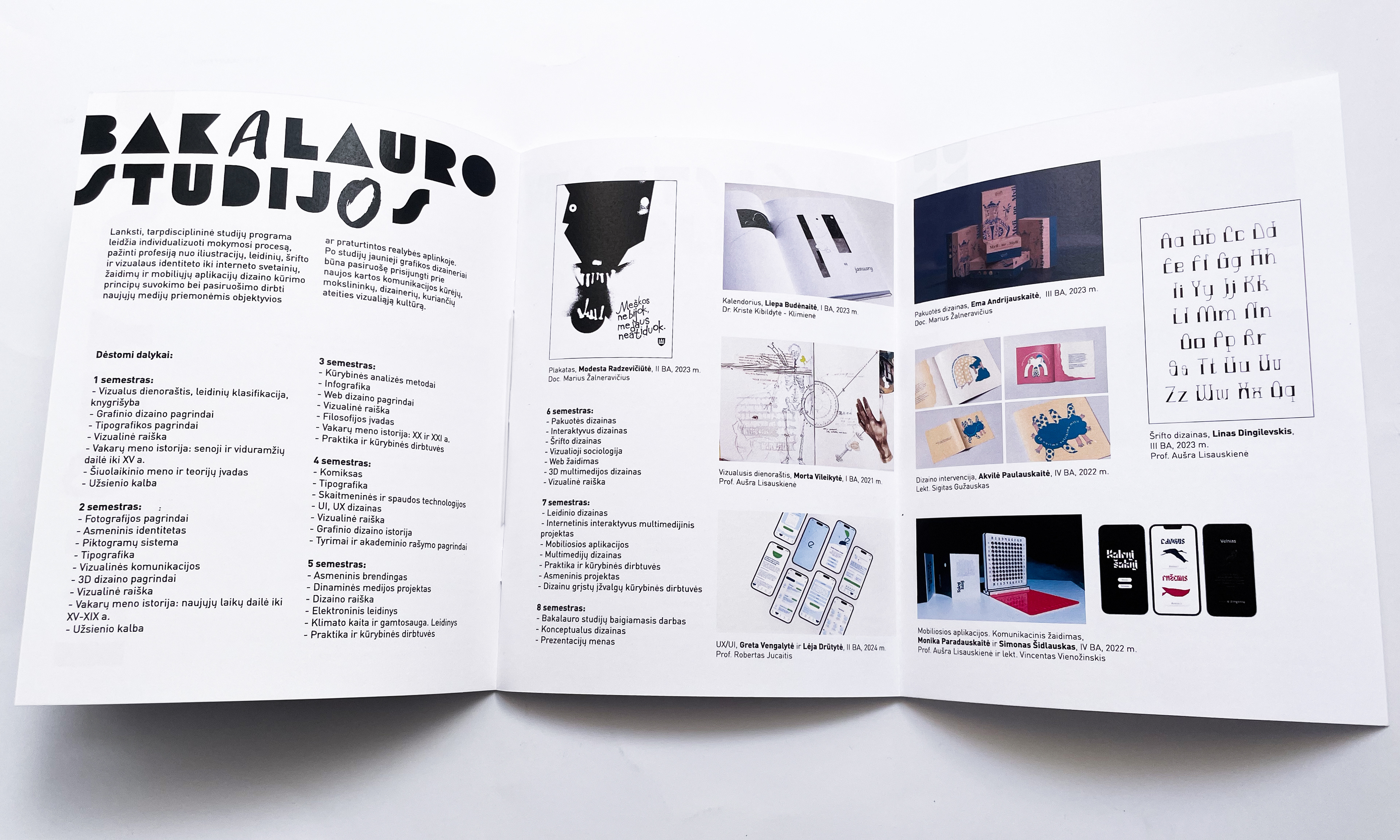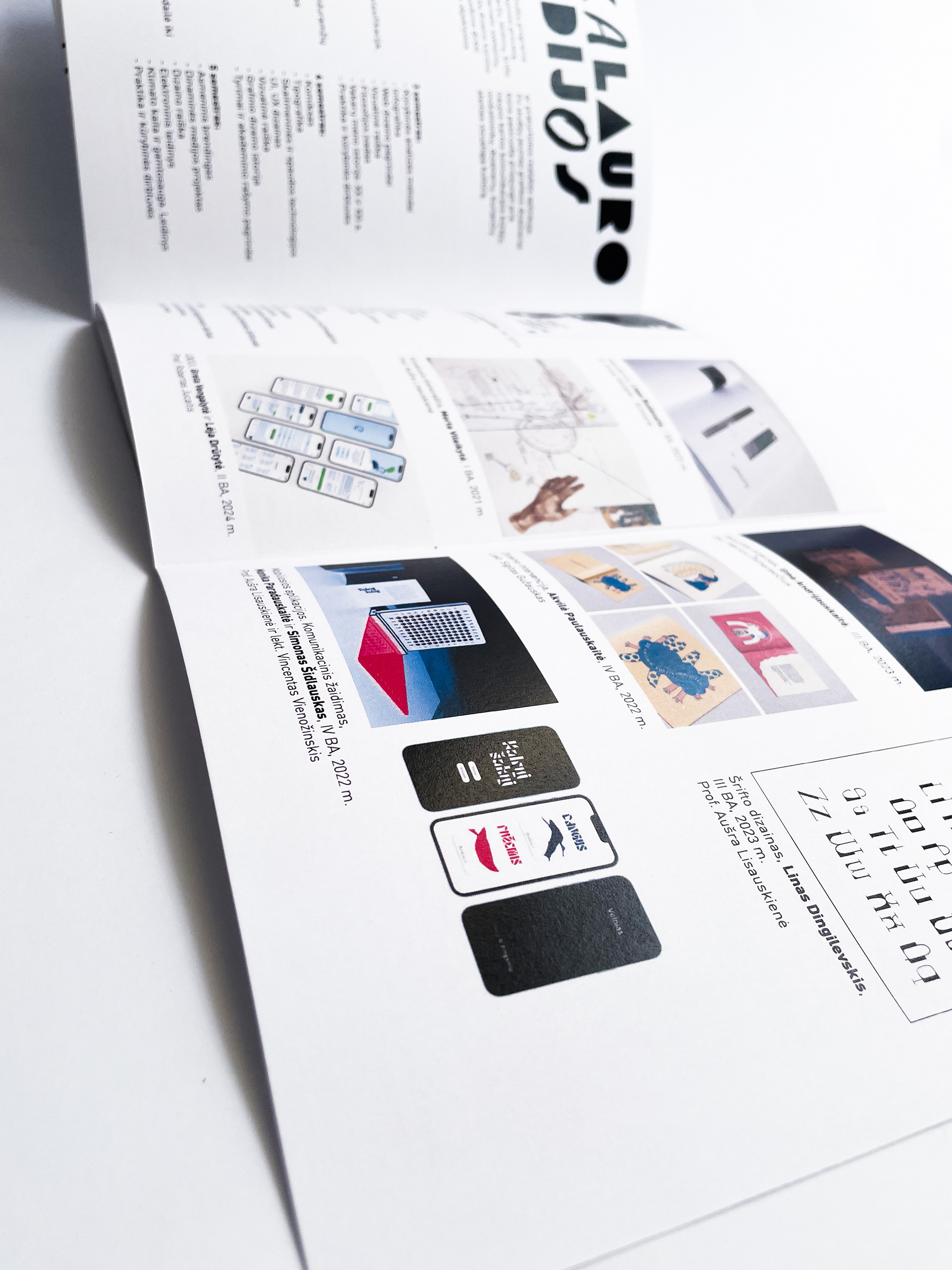 Prepare a booklet about the Graphic Design Department at Vilnius Academy of Arts. The content includes individually gathered information and visual material. The visual solution involves designing an individual layout with mandatory restrictions and requirements: a typographic spread (expressing style through typography), a two-colour spread, a monochrome spread, and a spread with an insert or different-sized addition. The booklet is prepared for printing according to VDA press and general digital printing requirements.