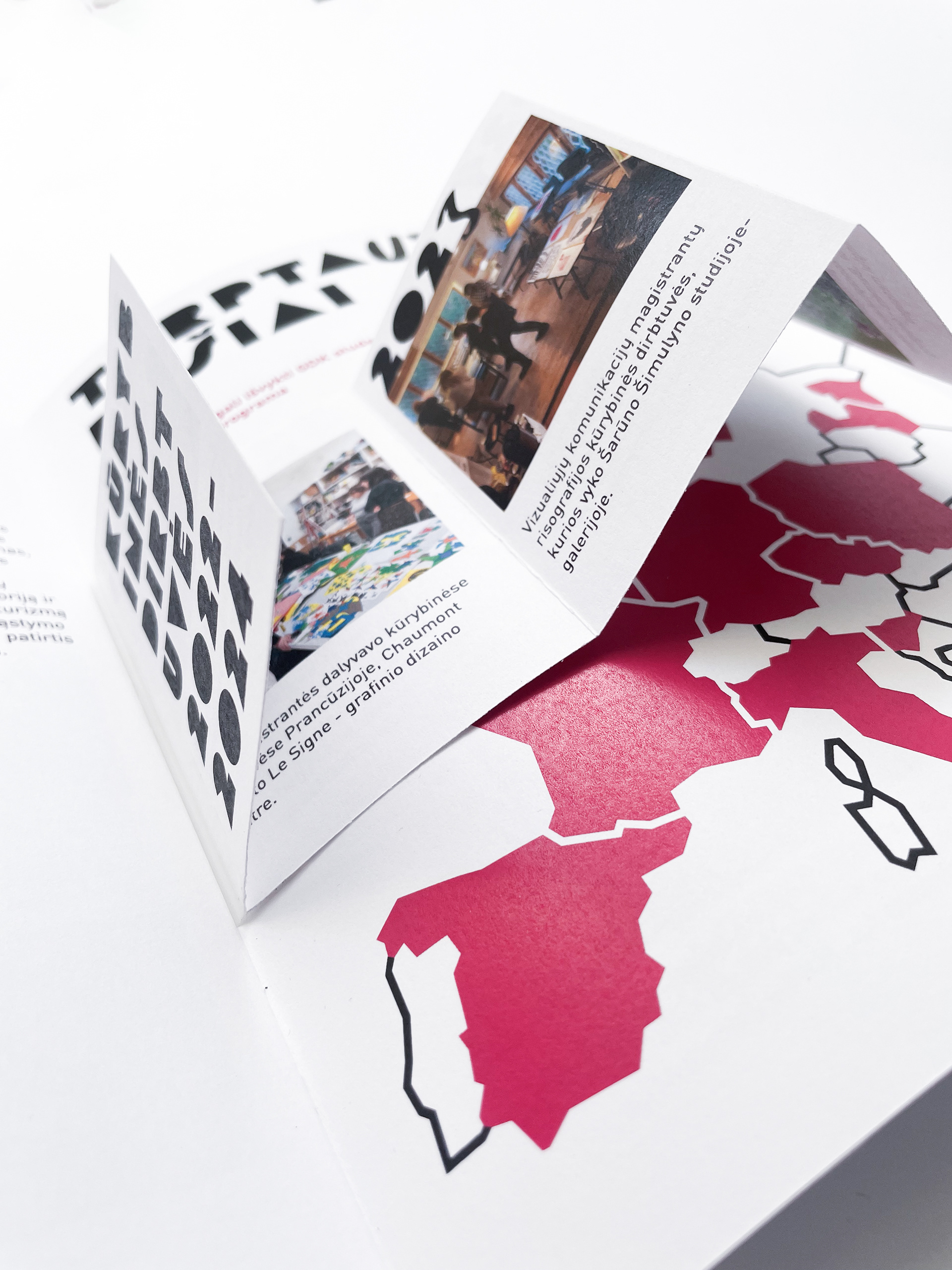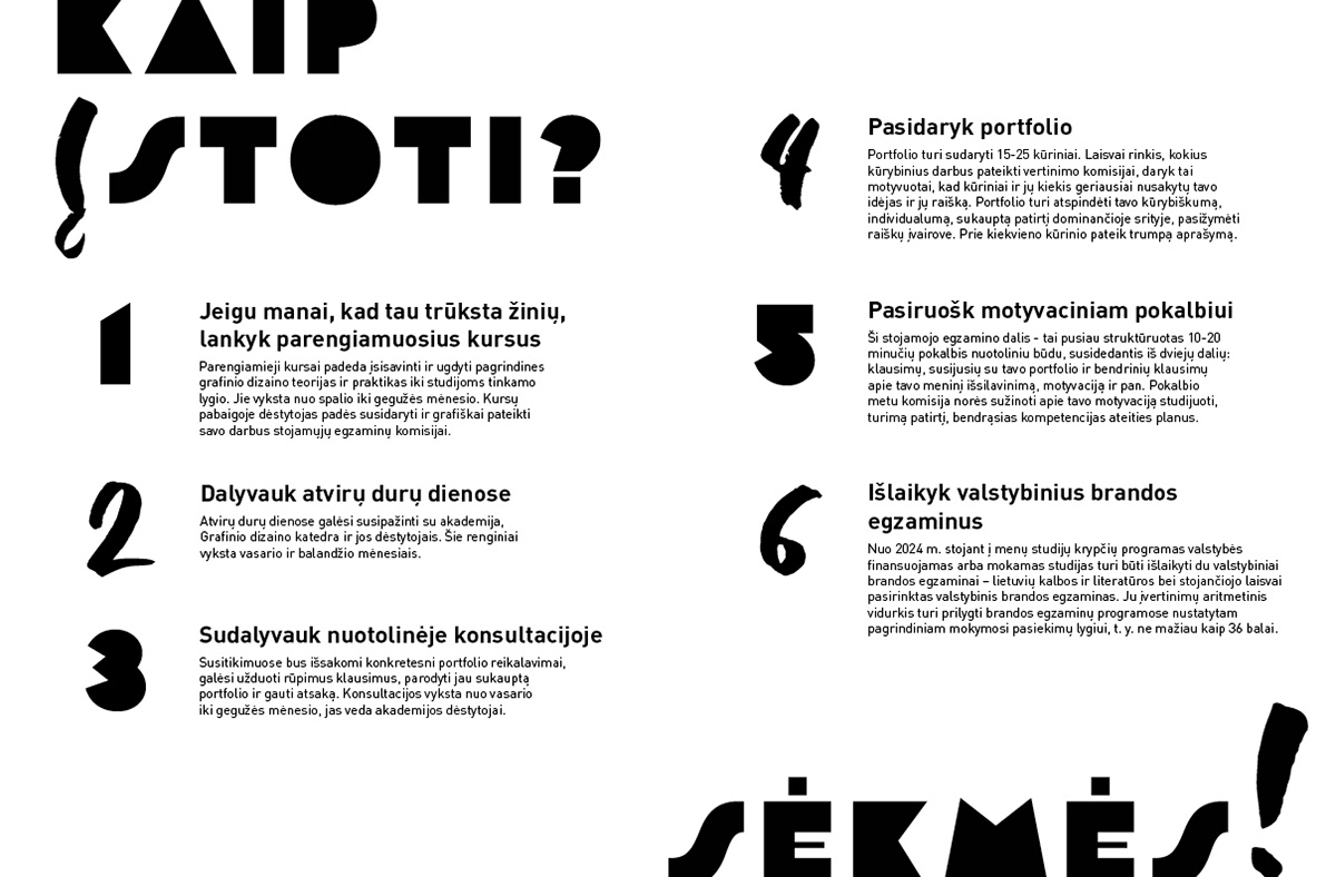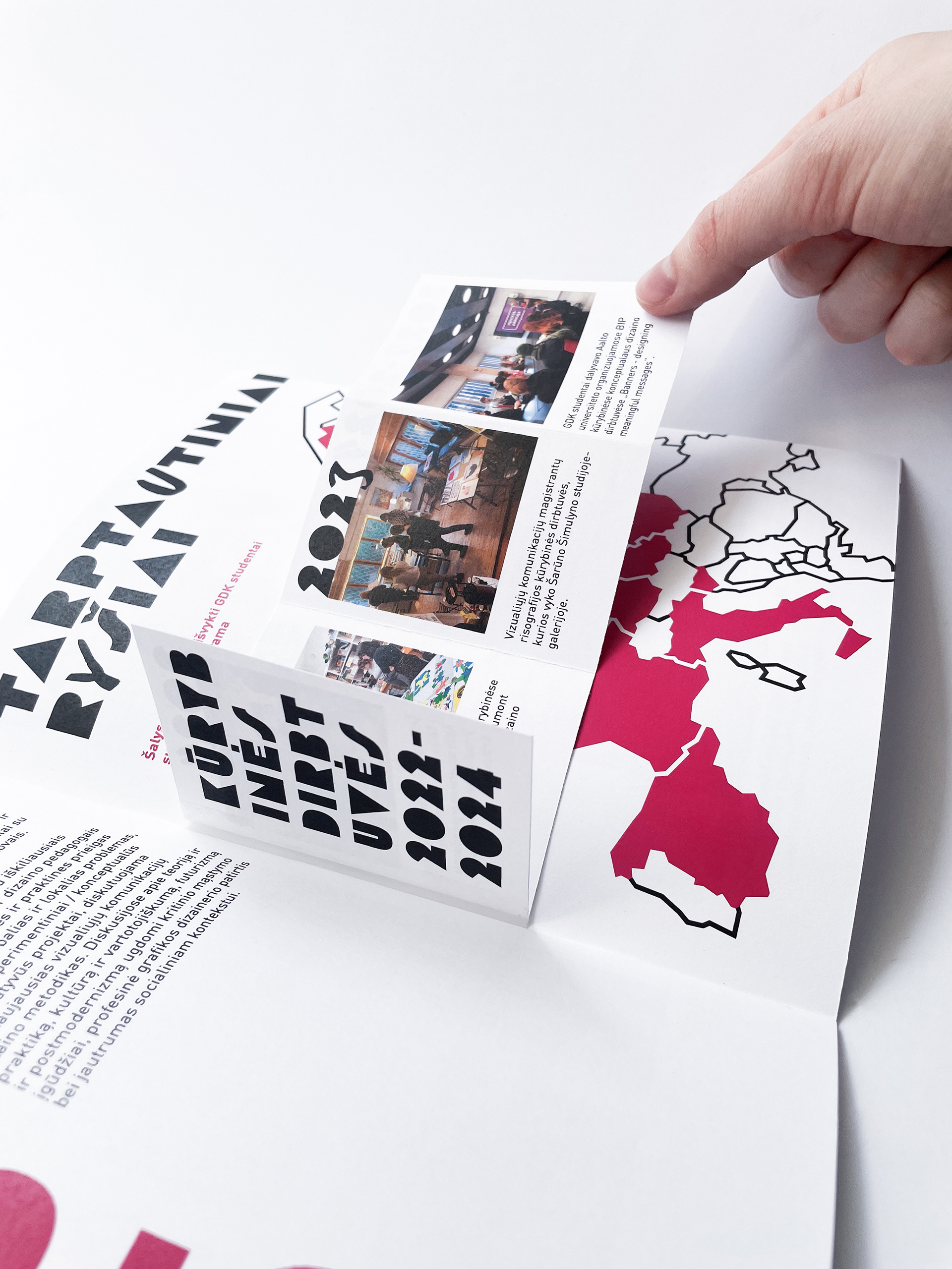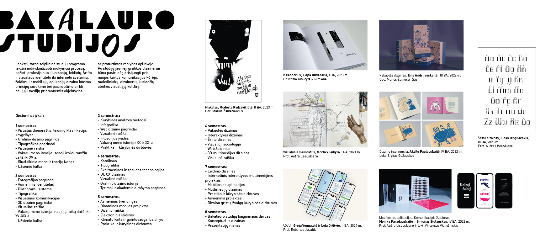 Prepare a booklet about the Graphic Design Department at Vilnius Academy of Arts. The content includes individually gathered information and visual material. The visual solution involves designing an individual layout with mandatory restrictions and requirements: a typographic spread (expressing style through typography), a two-colour spread, a monochrome spread, and a spread with an insert or different-sized addition. The booklet is prepared for printing according to VDA press and general digital printing requirements.
