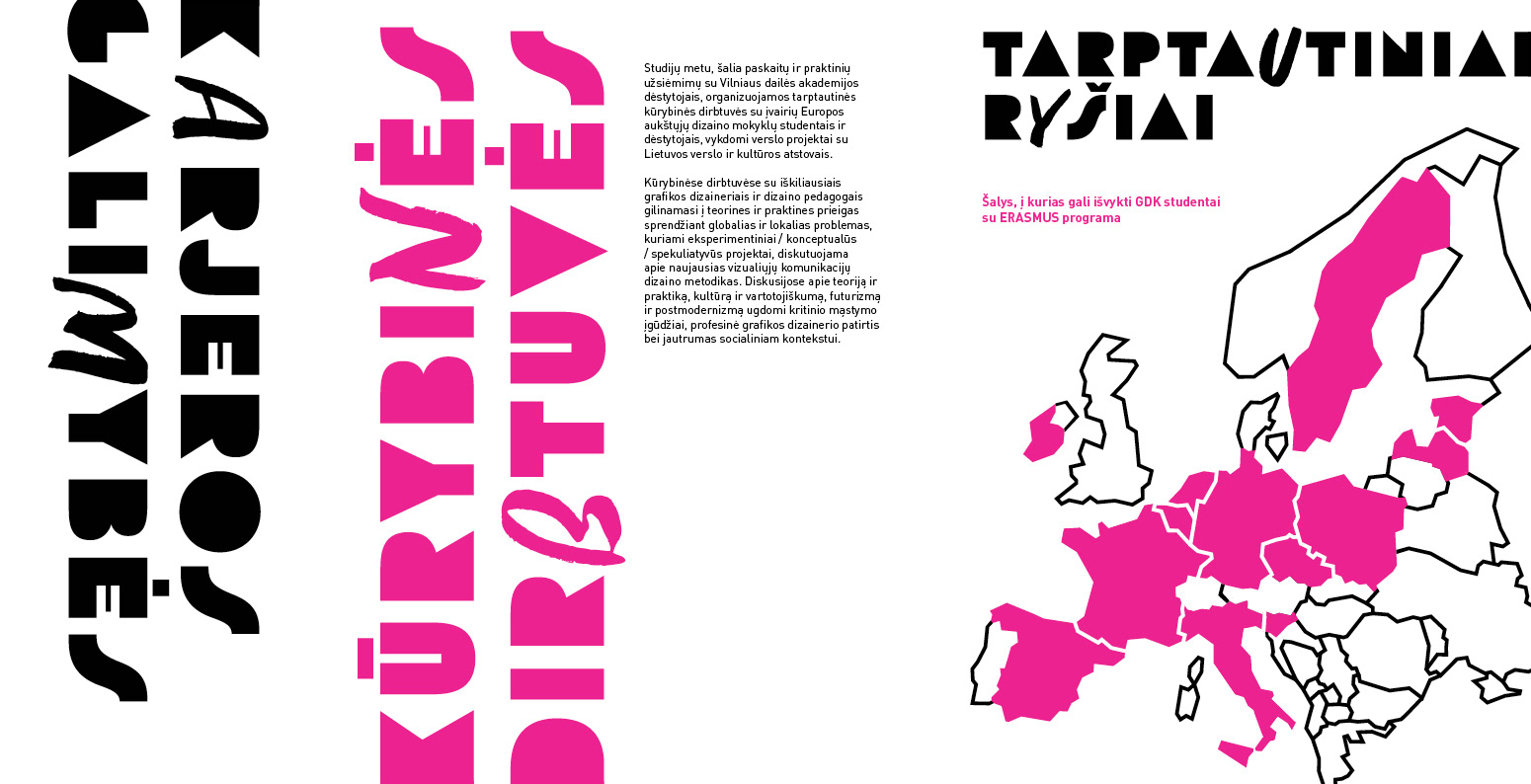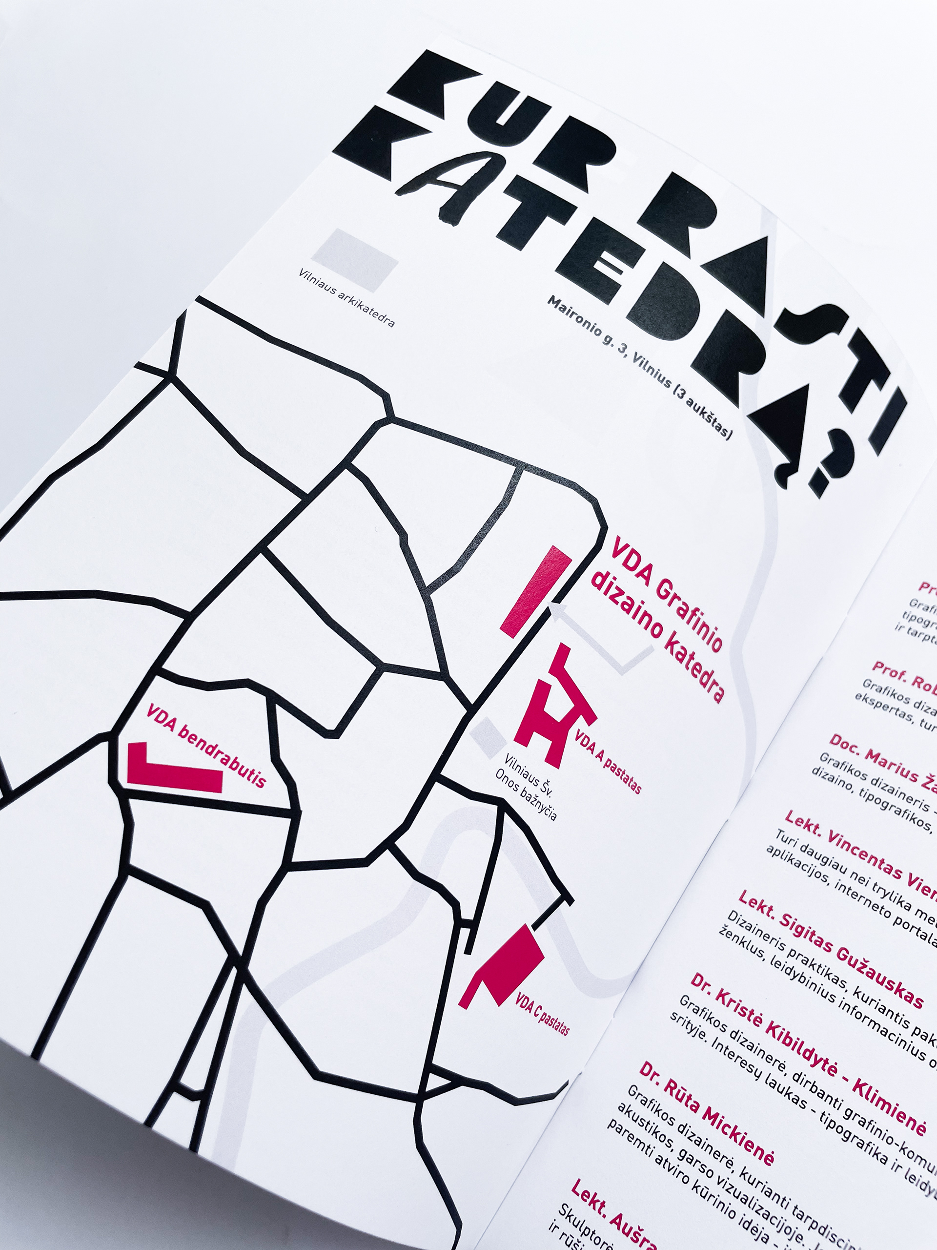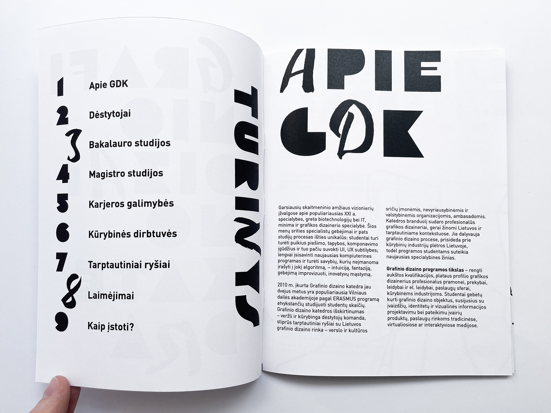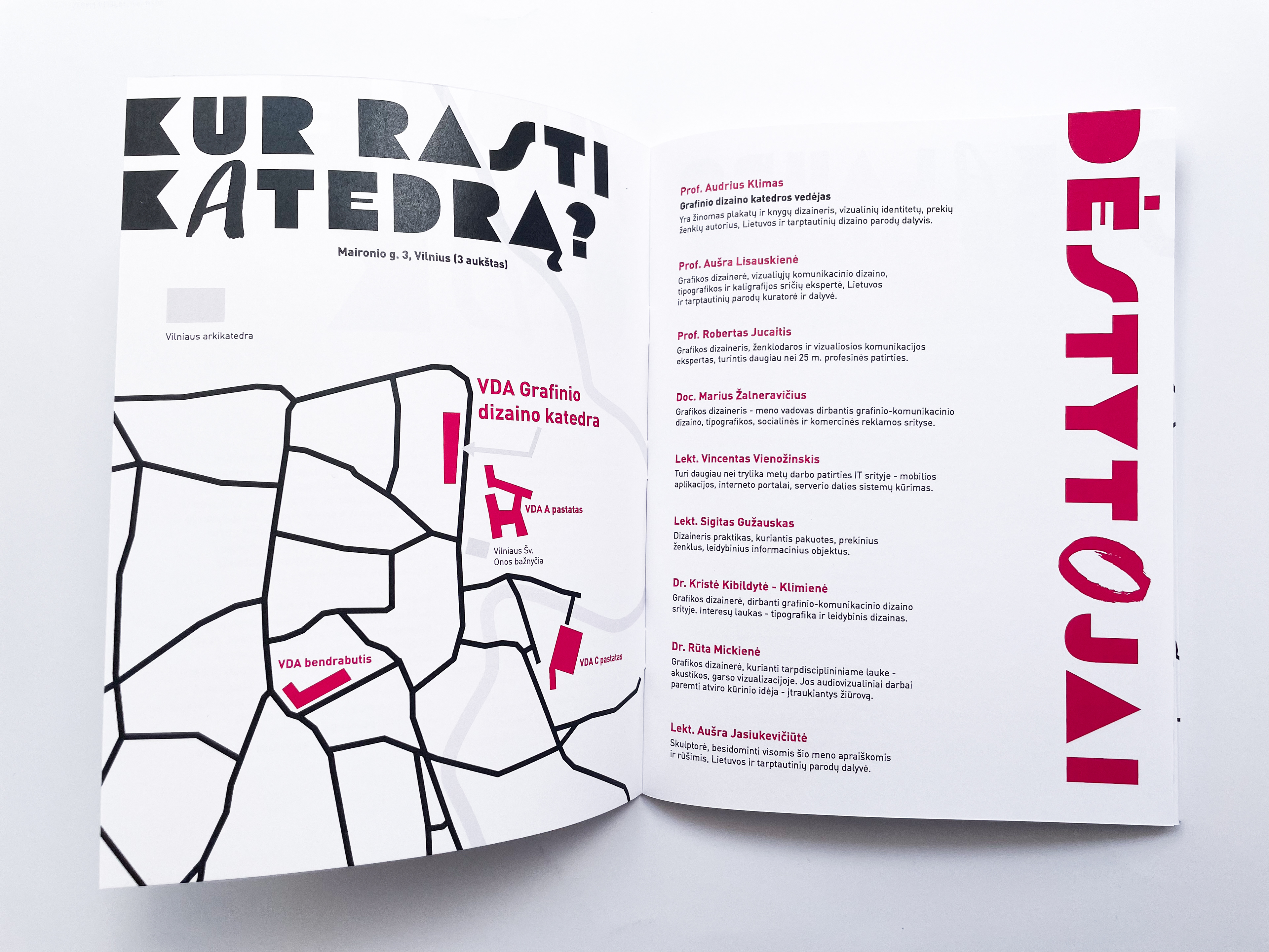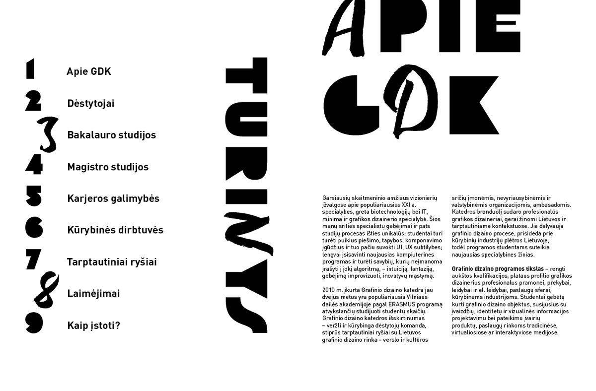 Tipografinis leidinys, kuriame sukomponuojami du šriftai. Antraštėse naudojami šriftai savo dizainu atspinti grafinio dizaino puses - analoginę ir skaitmeninę. Taip pat naudojama tik viena akcentinė spalva. Leidinyje pristatomi Grafinio dizaino katedra ir jos dėstytojai, bakalauro ir magistro studijos, kūrybinės dirbtuvės, studijų užsienyje galimybės, laimėjimai bei stojimo patarimai.