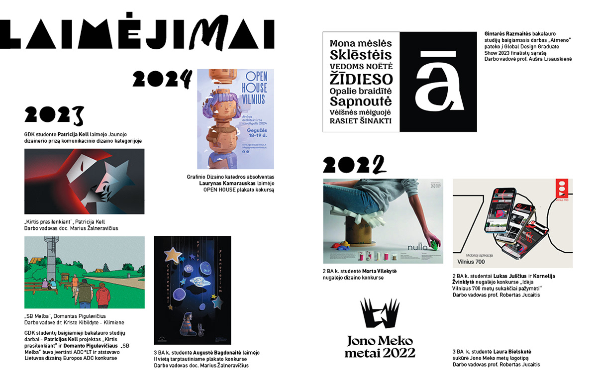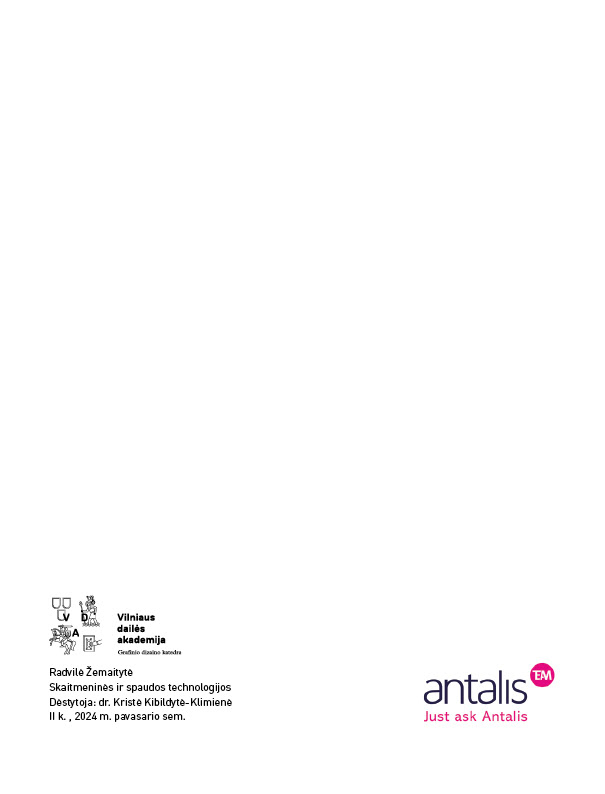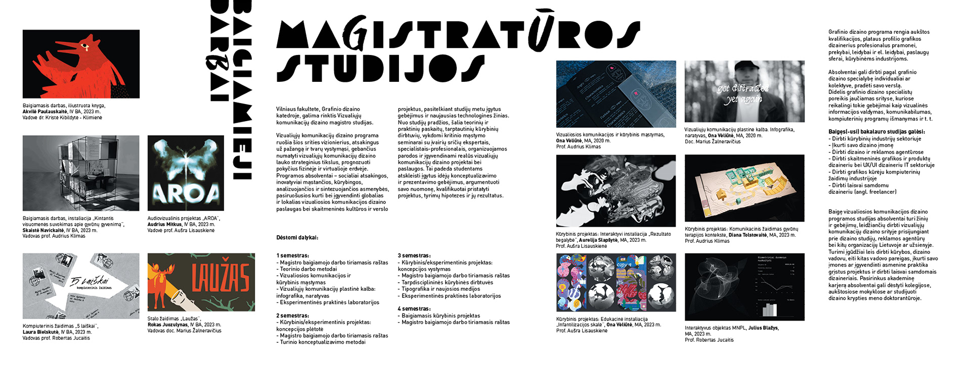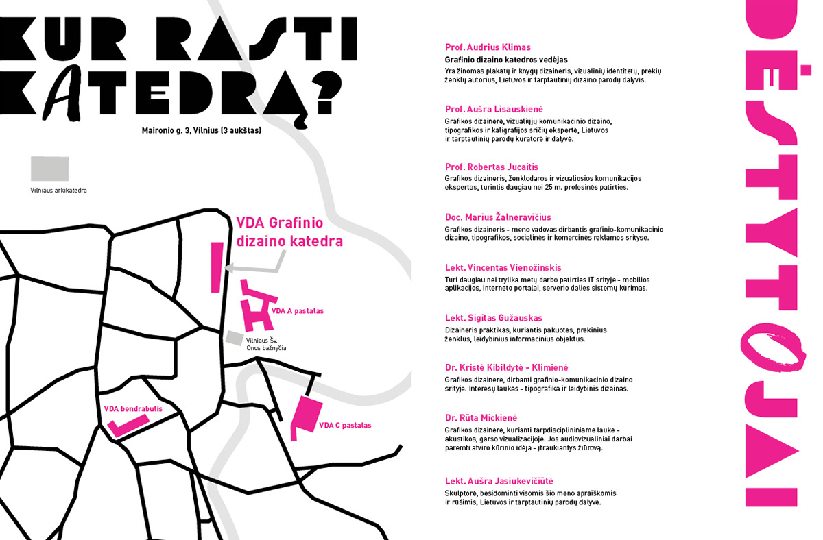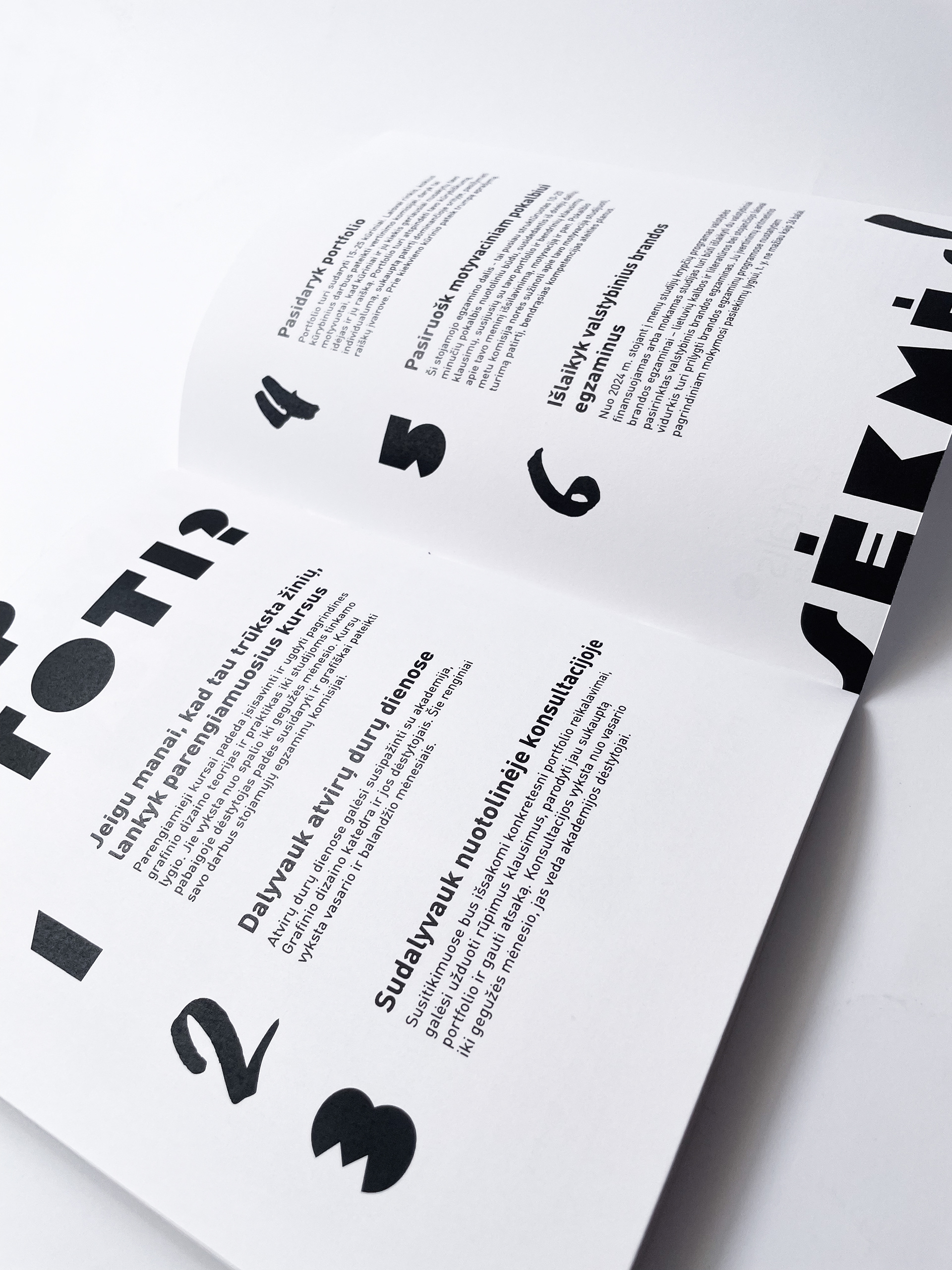 Tipografinis leidinys, kuriame sukomponuojami du šriftai. Antraštėse naudojami šriftai savo dizainu atspinti grafinio dizaino puses - analoginę ir skaitmeninę. Taip pat naudojama tik viena akcentinė spalva. Leidinyje pristatomi Grafinio dizaino katedra ir jos dėstytojai, bakalauro ir magistro studijos, kūrybinės dirbtuvės, studijų užsienyje galimybės, laimėjimai bei stojimo patarimai.
