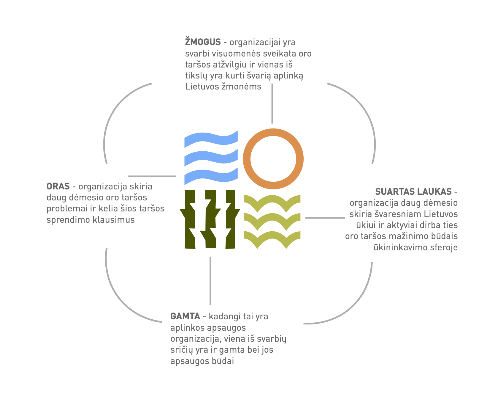 Raktažodžiai: Kompetetingas – “Competent” (patikimas, protingas, sėkmingas). Logotipą sudaro 4 elementai. Žmogus - organizacijai yra svarbi visuomenės sveikata oro taršos atžvilgiu ir vienas iš tikslų yra kurti švarią aplinką Lietuvos žmonėms. Oras - organizacija skiria daug dėmesio oro taršos problemai ir kelia šios problemos sprendimo klausimus. Suartas laukas - organizacija daug dėmesio skiria švaresniam Lietuvos ūkiui ir aktyviai dirba ties oro taršos mažinimo būdais ūkininkavimo sferoje. Gamta - kadangi tai yra aplinkos apsaugos organizacija, viena iš svarbių sričių yra gamta bei jos apsaugos būdai.